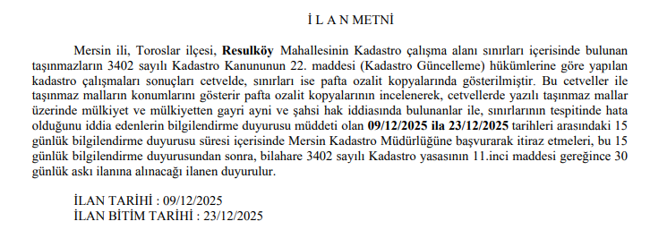 Resulköy Mahallesi Kadastro Güncelleme Bilgilendirme Duyurusu hk