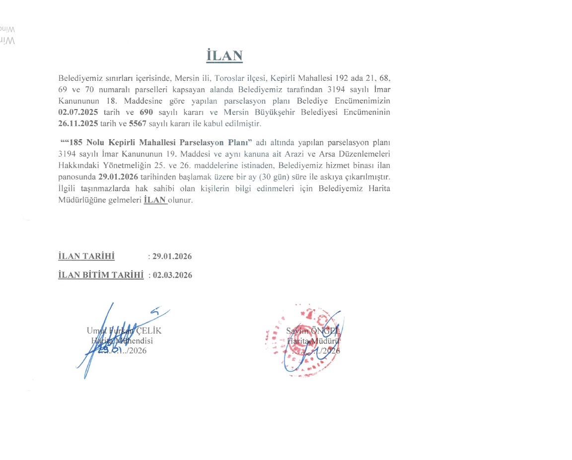 Belediyemiz sınırları içerisinde, Mersin ili, Toroslar ilçesi, Kepirli Mahallesi 192 ada 21, 68, 69 ve 70 numaralı parselleri kapsayan alanda Belediyemiz tarafından 3194 sayılı İmar Kanununun 18. Maddesine göre yapılan parselasyon planı Belediye Encümenimizin 02.07.2025 tarih ve 690 sayılı kararı ve Mersin Büyükşehir Belediyesi Encümeninin 26.11.2025 tarih ve 5567 sayılı kararı ile kabul edilmiştir.