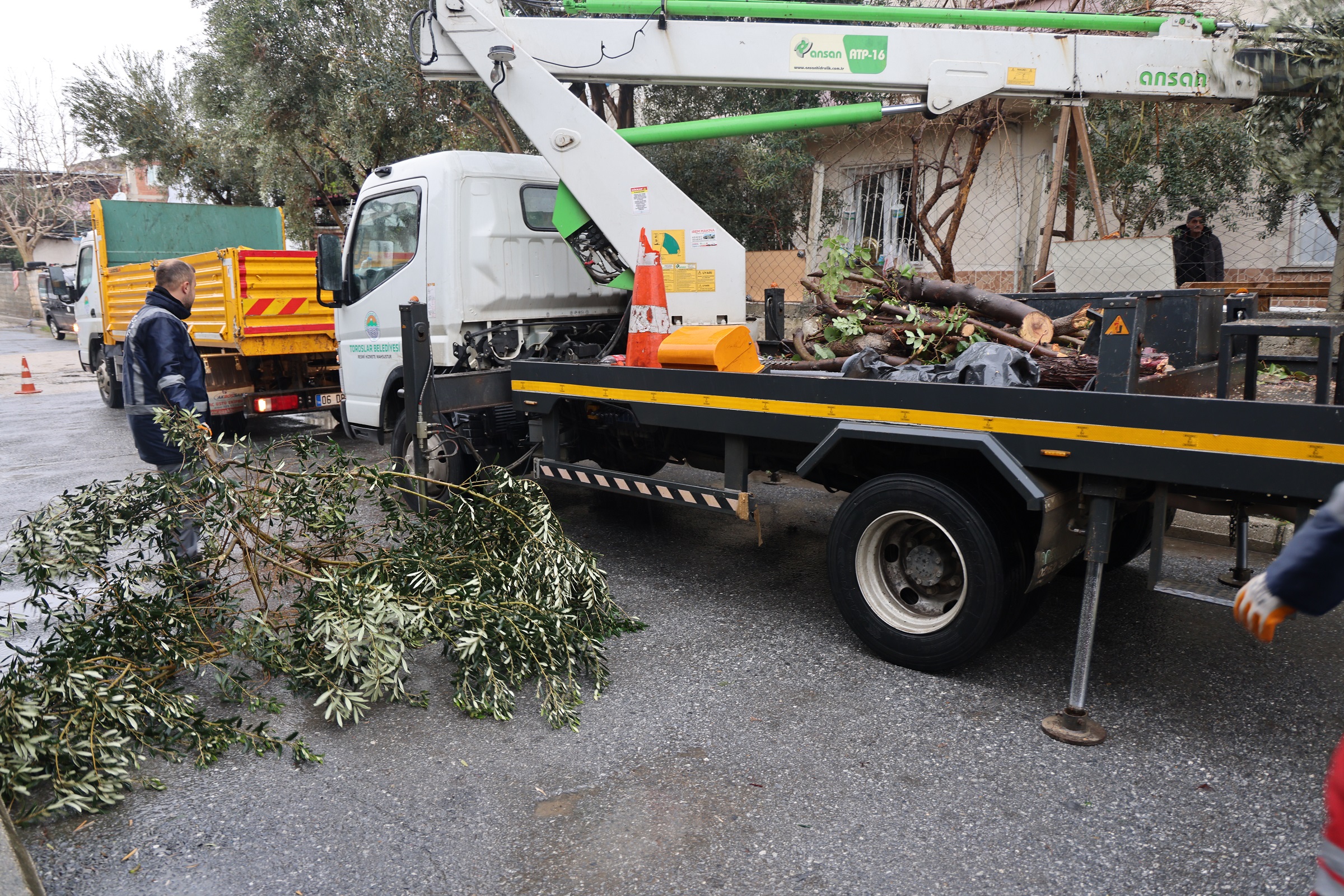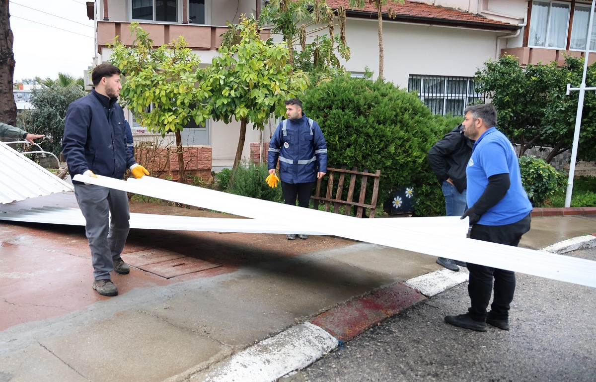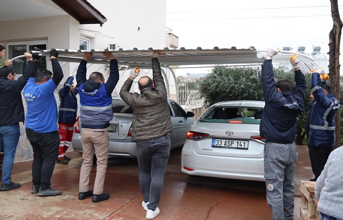 Belediyenin 444 41 33 numaralı Çözüm Merkezi’nden gelen ihbarları da hızla değerlendiren ekipler, fırtınanın zarar verdiği alanlara kısa sürede ulaştı. Bu kapsamda, bir hanenin devrilen araba garajı çatısı güvenli biçimde kaldırılarak gerekli düzenleme yapıldı.