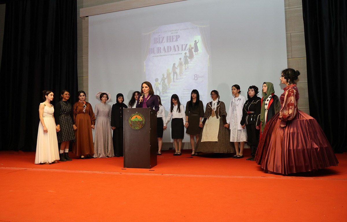 Mersin Cahit Zarifoğlu Anadolu Lisesi öğrencileri tarafından hazırlanan “Biz Hep Buradayız” adlı oyun Yunus Emre Kültür Merkezi’nde sahnelendi.Yoğun ilgi gören oyunda, tarihte iz bırakmış kadınların yaşam hikâyeleri sahneye taşındı. Öğrencilerin sahnede sergiledikleri performans duygu dolu anlar yaşatırken, kadınların azim ve kararlılıkla nasıl güçlendiklerini anlatan oyun izleyicilerden büyük alkış aldı.